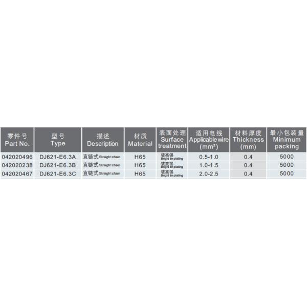 | DJ621-E6.3A | H65 | Bright tin plating | 0.5 - 1.0 |